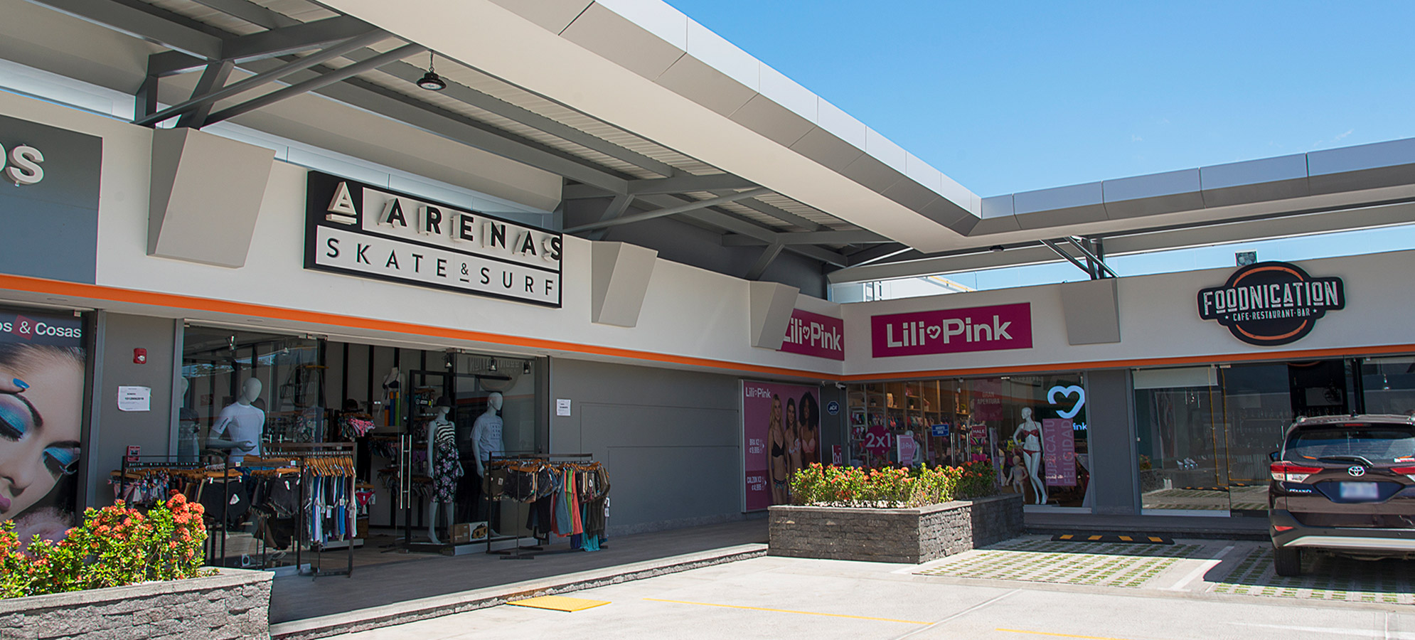 Es una plaza comercial abierta, con un lenguaje arquitectónico contemporáneo, de volúmenes limpios, aleros proyectados y colores sobrios. Su estructura principal es en metal con cerramientos livianos tipo gypsum, vidrio y aluminio compuesto. Además se combina el uso de concreto para elementos de cimentación y para el perímetro de la propiedad.
